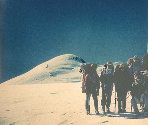 Мы на Казбекском плато (4200), сзади купол Казбека. Фото Константина Юрганова.