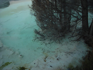 Долина и окружающие хребты сложены из желтушно-сизой породы, подкрашенной закатными лучами до неаппетитного мясного оттенка. Тепло и влажно. Источники воняют сероводородом. Посередь потоков горячей воды торчат вареные деревья. Их выглядывающие из земли корни покрыты толстым панцирем соли, и это похоже на прорванный трубопровод (в Питере, гнилой осенней ночью, где-нибудь на окраине). Живой и мертвый лес разделены резкой границей (как огнеметом отрезало). В живом - на земле мох и черника, в мертвом - соль,только соль. Выглядит так, что инопланетная (пардон, подземноводная) чума довольно быстро наступает на лес : у самой границы много "еще недоваренных" коряг.