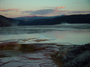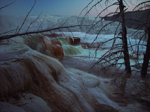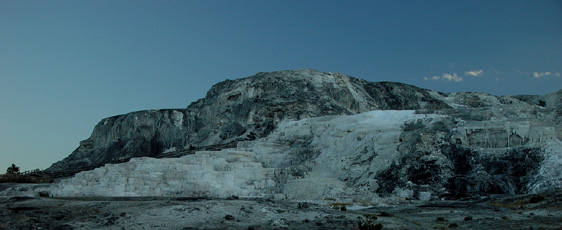 При въезде на территорию парка (5 минут от ворот) обнаруживается центр цивилизации : навороченный гостиничный комплекс, рестораны и терраса для просмотра заката. Н-да, на все вкусы (и кошельки) : хошь - в палатке ночуй, хошь - в многозвездочном отеле. Опять же и первая достопримечательность имеет место быть прямо здесь : горячие источники Mammoth Springs, сиречь Мамонтовы Родники.