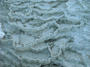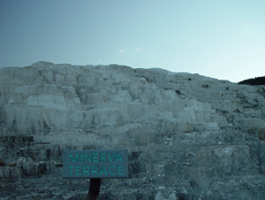 На долину постепенно наползает тень. Соляные отложения начинают испускать призрачно-голубоватое алебастровое свечение. Пересохший источник (многоступенчатая соляная терраса) издали смотрится как мрамор. Вид у сей игры природы слегка древнегреческий, и называется она соответственно : "Minerva terraсe". Вблизи же этот "мрамор-алебастр" оказывается мелкоячеистым : то ли соты, то ли крохотные ласточкины гнезда.