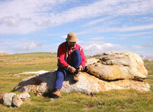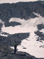 Внизу под нами лежало широченное осыпное плато. Его надо было пересечь и уйти дальше, траверсом хребта. Но - возникло две проблемы. Первая : у Андрея не оказалось дождеупорной куртки :-( Поэтому он размотал рулон пены, укутался в него аки буддийский монах в циновку, и со спринтерской скоростью поскакал с хребта на плато - искать подходящий камень, под которым можно хоть как-то спрятаться. Вторая же проблема была в том, что Дима крайне медленно перемещался по осыпям (отсутствие навыка плюс дождь). Так и двигались : Дима - как мог, Володя - перед Димой (подсказывая ему, куда лучше поставить ногу), я - прикрывая картой нос от града и пытаясь понять куда ж нам дальше, а Андрей - перебежками от камня к камню.