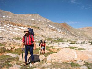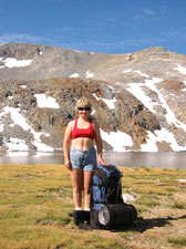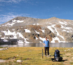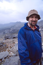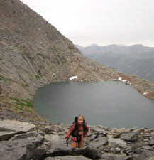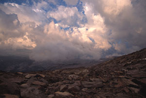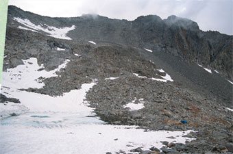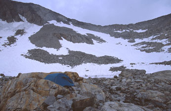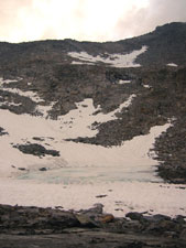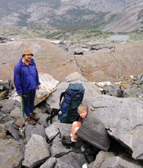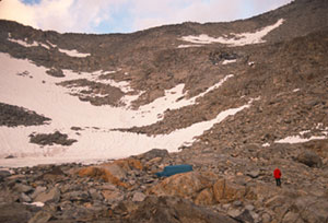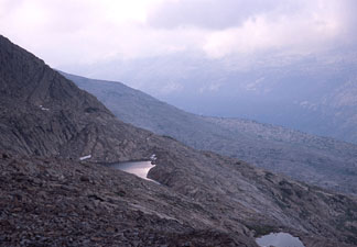 Когда дошли до противоположного края плато - открылся дивный вид на дальнейший траверс. Жуткого вида осыпи, а над ними - Cathedral Range (это хребет такой, кто понимает :-)). В хорошую погоду, должно быть, изумительно красиво. Но - под дождем-градом-грозой... Володя посмотрел на это великолепие и сказал : "Я знаю в английском языке три слова на букву "f" : "f***", "f***" и "f***". Однако делать нечего. Приспустились с плато к небольшому (но красивому даже в такую мерзкую погоду) озерцу, лежащему в осыпной чаше. Забились все вчетвером под особенно большой камень и стали совет держать.