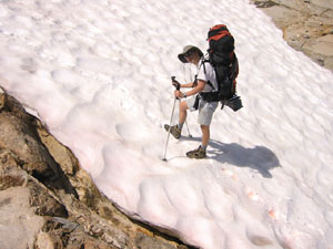 Сначала нам нужно было на небольшой перевал. Шли с удовольствием - по травке, по камушкам, по снегу. Красиво, приятно.