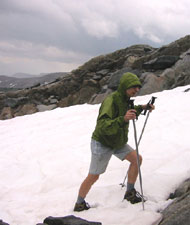 Но... нет, не надо мне объяснять, что летом в Калифорнии не бывает дождей. Как раз когда мы добрались до перевального взлета - началась гроза. Самая натуральная, да с ветром и градом. Мне, пожалуй, еще ни разу в жизни не доводилось наблюдать, чтобы молния и удар грома раздавались одновременно (причем непосредственно рядом со мной). А поскольку как раз в этот момент мы торчали на хребте...