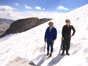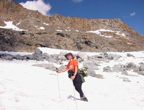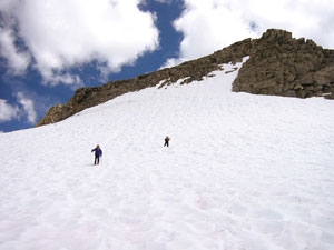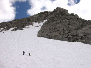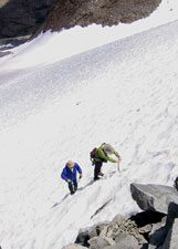Сначала хотели спускаться не там, где поднимались, а по скальному ребру на перевал (чтобы обойти крутой участок снега). Но когда подошли поближе и глянули на это ребро, то Андрей спрогнозировал три-четыре веревки перил. Решили не маяться и обойтись одной веревкой по снегу - то есть, все-таки спускаться там же, где и вверх шли. По скалам слезли до границы снега (я по дороге уронила немаленький камень, хорошо что не Андрею на голову). Кинули веревку, а после веревки продолжили бегом на пяточках, благо снег был самое то что надо : и неглубокий, и достаточно жесткий.