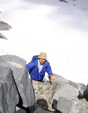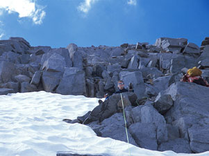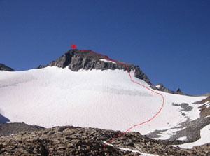 Идти мы нацелились по вычитанному в книжке описанию : подойти по леднику под небольшой кулуар, с него вылезти на разрушенные скалы и оттуда - на предвершинный гребень, а дальше пешком.