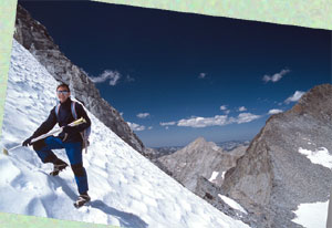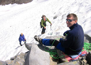 Правда, от озер этот самый кулуар выглядел как-то подозрительно круто, но мы предположили, что когда подойдем - он "ляжет" (ну в самом деле : маршрут-то - всего "троечка", откуда бы тут взяться стенкам). И точно : оказалось все не так уж страшно. Градусов тридцать всего (ну разве что в самой верхней части кулуарчика до сорока пяти дотянуло - от силы). Примотали к ботинкам кошки, полезли. Нас с Володей понесло зачем-то вправо - там оказалось чуть-чуть покруче и пожестче, под снегом очень близко был лед. А Андрей с Димой, как умные люди, обошли левее - поположе и помягче. Правда, для Димы мы все же кинули веревку (в основном, для собственного спокойствия). Выглядело это так : Володя долез до скал, снял рюкзак и, отобрав у меня кайло, спустился к Диме. Андрей тем временем обустроился на большом выступе, достал веревку и кинул вниз. Володя обвязал Диму прямо булинем под мышками (чтобы обвязку не доставать на непологом склоне), и пошел сзади, подбадривая и давая "ценные указания". Андрей при этом страховал Диму сверху. Все как надо, все почти что по правилам :-))
