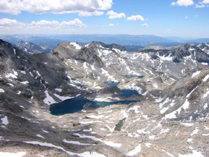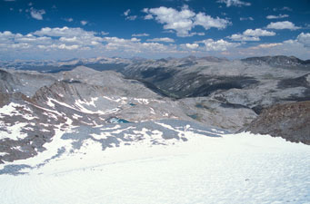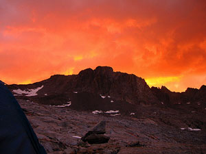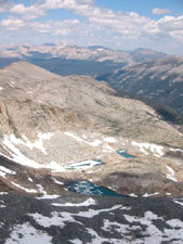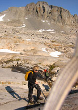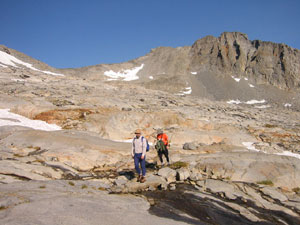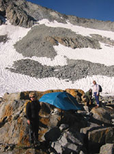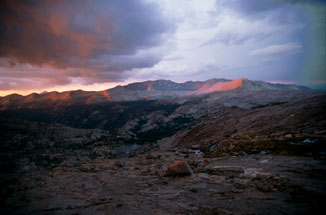 А надо сказать, что у нас не было ясности с траекторией спуска от "базового лагеря" в основную долину (которая Lyell Canyon). Мы пытались (сидя на вершине ) высмотреть какие-то варианты, но все возможные пути либо упирались в скальные сбросы (проходимость которых сверху была совершенно неясна), либо уводили по довольно пологим осыпям, но закладывали при этом огромный крюк в ненужную сторону. Поэтому к лагерю мы шли с твердым пониманием, что второй раз на колдобинах ночевать не хотим - но вот куда именно следует переносить лагерь... Володя вообще предлагал просто сдвинуться на двадцать метров по осыпи (вроде там было место поровнее) - а завтра утром, "надев ботинки на свежую голову", уже решать, как будем спускаться.