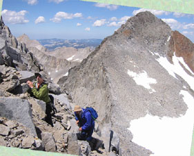 Вылезли на гребень. Увидели, что до вершины еще - пилить и пилить :-) С восторгом посмотрели на пейзажи в обе стороны от хребта. Помахали ручкой проходившей мимо команде. Пофотографировались. Полезли на вершину.