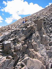 Дальше была разрушенная скала. До такой степени разрушенная, что почти уже и не скала вовсе, а все та же осыпь, только вертикальная (да-да, как в том анекдоте : "Идем это мы с Балыбердиным, Царствие ему Небесное, по отрицательной сыпухе" :-)).