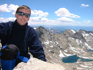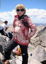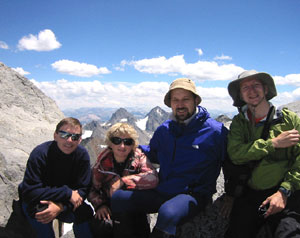 На вершине (отчетливой скальной пирамиде) уже сидело четыре человека. Мы тоже сели. Места на всех еле-еле хватило :-) Съели шоколадку, еще пофотографировались. Обменялись парой вежливых реплик с "соседями" ("Вы откуда?" - "Из России." - "О. Ну тогда, после ваших семитысячников, для вас наши горы должны казаться маленькими и простенькими" - мы не стали разочаровывать ребят :-)).