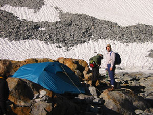 и вроде бы позволяющий слезть до травы минуя жуткие "бараньи лбы", ограничивающие верхнюю ступень долины. Решили, что, пожалуй, по нему-то и пойдем. Пришли в лагерь (вот тут не помню : вроде что-то ели - или не ели...), собрали барахло и пошли обратно, к снежнику, слегка сбрасывая высоту. Спускаясь, мы практически сразу переместились с осыпи на ... ну, такая странная форма рельефа, не то очень крутые каменные плиты, не то довольно пологие скалы. Скоро стала попадаться и трава (типа, чахлые кустики, пробивающиеся меж камней). Минут через сорок ходу нам даже встретилась ровная и уютная площадка, как раз под нашу палатку. Мы облизнулись на нее и пошли было дальше, но не успели отойти и ста метров, как начался дождь. Мы решили, что это явный намек (т.к. семь вечера уже, а мокрые "пологие скалы" - не самый приятный рельеф), вернулись к площадке и встали на ночевку.