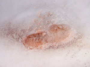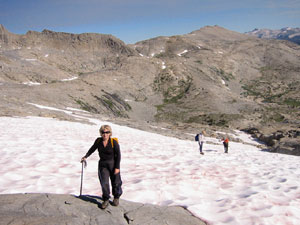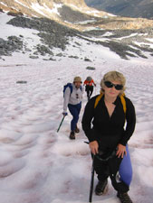 Наконец вышли на снег. Он был мягкий, но неглубокий. Неспешно двинулись наверх, удивляясь разбросанным тут и там кроваво-алым пятнам. Когда-то мне рассказывали, что это вроде бы какие-то микро-водоросли приспособились жить на высоте, и от горняшки стали красного цвета :-). Не знаю. Но на Кавказе, к примеру, такая штука тоже есть, только там у нее другой оттенок - более холодно-пурпурный.
