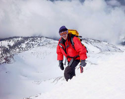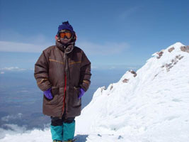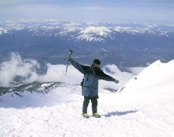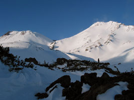 На перегибе нас догнали два бравых молодца, которые вот уже час с лишним как шли по нашим следам (если можно назвать следами глубоченные ямы, протоптанные нами в раскисающем глубоком снегу). Бравые молодцы с ног до головы были увешаны железом (в том числе лесенками и лавинными лопатами), и вид имели такой, словно собрались не на Шасту, а по меньшей мере на Хан-Тенгри. Однако ж, выйти вперед и потропить в свою очередь они не пожелали. Так что мы, посидев и отдохнув, двинулись дальше - взбираться по склонам предвершинного пупыря под названием "Misery Hill" (что мы перевели как "Груда Обломов". Говорят, он так называется потому, что если идти на Шасту не из Hidden Valley, а из соседней с ней Avalanche Galley ("Лавинное Ущелье") - то кажется, что этот самый Hill и есть вершина - и представьте обиду народа, который вылезает на него и видит, что до вершины еще - три дня верблюдами). (на фотографии этот самый пупырь как раз у меня за спиной прячется).