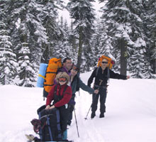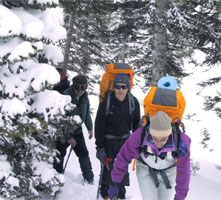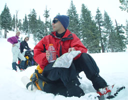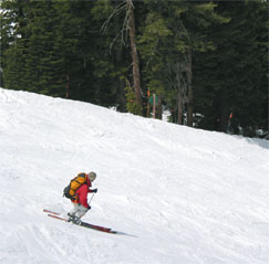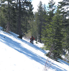 "Акклиматизационный выезд" предполагал, с одной стороны, активно подвигаться на высоте 3000м, а с другой стороны - сэкономить жизненно важную сумму в 50 баков на каждого. Для этих целей было предпринято пешее "восхождение" на горнолыжный курорт Sugar Bowl. Отвезя Светку с Серегой (желавших кататься как белые люди) к подъемнику, мы (Миша, Юра и Ира) заехали на машине в какую-то глухомань, распихали по рюкзакам ботинки, лыжи и пуховки, и полезли вверх на хребет, увязая по колено в снегу и стараясь не наткнуться на работников курорта (дабы избежать резонного вопроса "А где ваши билеты").