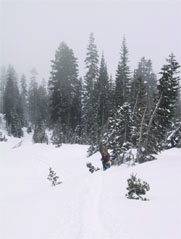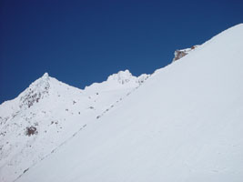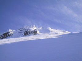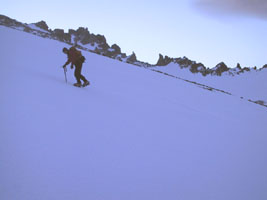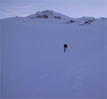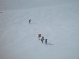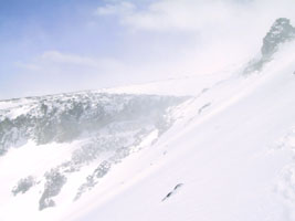 Сказать честно, термин "побежали" по отношению к нашему способу передвижения - это некоторое поэтическое прувеличение. Тот самый снег, который мы месили на подъеме, за это время совсем расквасился и начал бессовестно хватать за конечности (вы можете себе представить : ставишь ногу - нога погружается выше колена, а крутизна склона такова, что оставшееся над поверхностью :-) тело пытается упасть вперед (вниз). Идеальные условия для переломать все что можно).