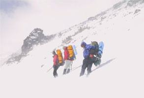 Дальше, дальше... Опять месили мокрый глубокий снег. Ветер... как это говорят старые волки : "Ветер бывает двух направлений : "в морду" и "прямо в морду"". Очень хотелось кушать, но кушать было только сухофрукты и Cliffbars (батончики из жуткой смеси шоколада, орехов, кураги, сухого молока, изюма, меда и печенья. "Сухое брошево", кто понимает. Причем, если от брошева воротит обычно на четвертый день похода, то от Cliffbars - уже на второй). Сия гастрономическая безысходность подвигла меня попробовать купленное из чисто естествоиспытательского интереса углеводистое желе "с банановым вкусом". Согласно рекламе, эта штука впитывается в кровь через пятнадцать минут после съедания, и "горючего" хватает примерно на час работы (короче говоря, буржуйский аналог тех самых десяти таблеток глюкозы, которые обычно выдавались в качестве сухого пайка "при ином социальном устройстве"). Желе и впрямь оказалось "банановое". Вторую упаковку, "шоколадную", у меня выцыганил Дима. Ну что сказать. Реклама не обманула :-) : "они как ломанулись, как ломанулись" :-))
