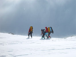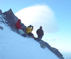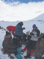 Ну таки вот. Забрались мы в палатку. Вместе со всем барахлом, натурально. На улице оставлять не рискнули ничего, кроме кошек и ледорубов (решив, что если уж ветер станет настолько силен, что унесет железо - то нам оно все равно не понадобится). Тут выяснилось, что информация насчет "шестиместности" этой палатки не совсем соответствует действительности. То есть, конечно, если в лесу, да растянуть палатку во всю ширину, да барахло в тамбур положить - шесть человек влезает. Но вот когда в комбинезонах и пуховках, да с мешками...