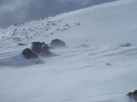 Тут как раз мы вышли в цирк, именуемый Hidden Valley (высота над уровнем моря 3100м). Это было предполагаемое место для постановки базового лагеря. Ветер превратился в нечто совсем уже несообразное - с ног, конечно, не валил (пока что), но пейзажи вокруг стали совершенно лунными из-за несущихся по воздуху снежных покрывал, рассмотреть что-либо за которыми было не очень просто.