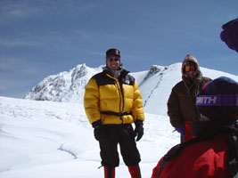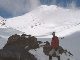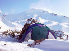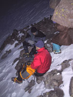 Возник вопрос : как жить дальше. В смысле, где и как ставить палатку. Снежную стенку строить было очевидно не из чего, пришлось искать хоть какой-нибудь мало-мальски подходящий камень, дабы за ним спрятаться. Удалось это с трудом и не до конца. Т.е., после десяти минут шастания по плато мы нашли нечто, за которым дуло слабее, чем во всех остальных местах. С помощью ледорубов, лавинной лопаты и соответствующих заклинаний, мы устроили под этим камнем подобие ровной площадки и водрузили туда огромную Серегину палатку, в которой, согласно рекламе, хорошо помещается шесть человек. М-да... Если на клетке слона прочтешь надпись "буйвол"... впрочем, об этом позже.