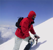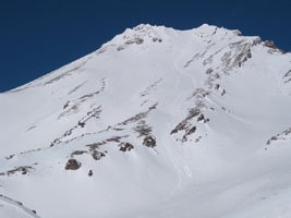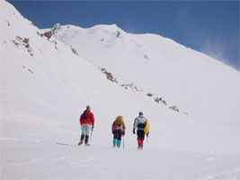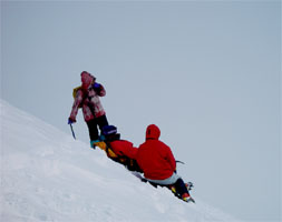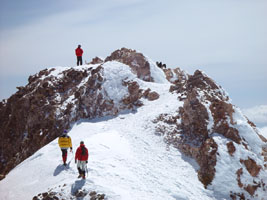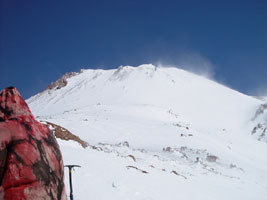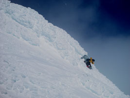 Впрочем, на предпоследнем взлете оказался весьма крутой твердый фирн, покрытый ледяными застругами. Видимо, оттуда за ночь все сдуло. Так что нам пригодились не только кошки, но местами и клювы ледорубов.