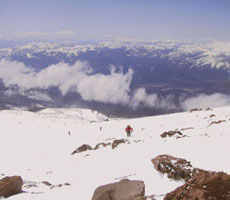 Пожалуй, пришел момент для небольшого комментария. Значитца, с погодой нам повезло - было тепло и практически безветренно. Зато, благодаря разразившемуся где-то, где ему положено, урагану Эль Нинья - над Шастой всю предыдущую неделю резвился уже упоминавшийся снежный шторм. Поэтому, там, где обычно народ бодро взбегает в кошках по фирну - нам пришлось тропить в глубоком вязком и мокром снегу. Тропили в основном "Два Кабана - два" : Юрка и Дима.