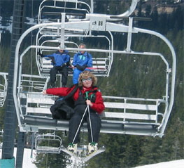 Спустившись к низу подъмника, мы вдруг внезапно осознали, что за спинами-то - мешки, а сидения расчитаны не на одногорбых верблюдов, а на нормальные человеческие пропорции . Пришлось скидывать рюкзаки на одно плечо и плюхаться враскоряку на подъезжающее сзади кресло подъмника, что называется, "с криком "Банзай"". Однако, удалось не свалиться, и мы успешно добрались доверху, откуда благополучно спустились еще раз (и еще раз, и еще раз).