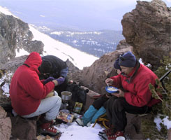 Ладно. Сняли ботинки, раскочегарили горелку и стали готовить ужин, стараясь абстрагироваться от совершаемых палаткой диких прыжков и попыток взлететь. Поели - вроде стало теплее. Ветер, однако, усилился. Наверно, тоже чего-нибудь перекусил.
