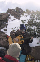Уставшие как сто китайцев, с Божьей помощью мы спустились к палатке. Палатка оказалась на месте, ветра не было совсем. По этому поводу, поужинали на улице. И даже попели песни, т.к. Дима категорически заявил, что он не согласный таскать гитару просто так. Вследствие вышеозначенных мероприятий заметно улучшилась погода.