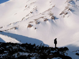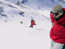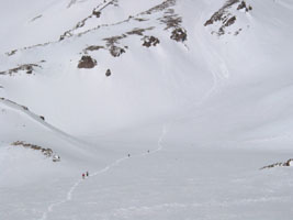 Спуск оказался просто кошмаром. Вы понимаете : вторая половина дня, солнечная погода, глубокий мокрый снег. Мало того, что ноги увязают "по самое абсолютно", так еще и на кошки и подошвы ботинок налипают огромные снежные "подушки", превращая ступню в полусферу выпуклостью вниз. И в таком вот духе - километр с лишним сброса высоты. Бр-р-р. Кое-кто попробовал отбросить условности и съехать на попе - щас. Снег вел себя как мягкое кресло для посетителей в кабинете у психологически-продвинутого чиновника : ты садишься, попа проваливается, ноги задираются выше головы - прошу вас, чувствуйте себя идиотом. Ужас, ужас. Под конец спуска, на самом последнем сбросе Диме-таки удалось прокатиться, но не на попе, а на небольшой лавинке (обошлось без последствий).