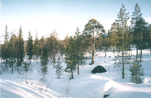 Спуск - просто подарок! Мягкими, округлыми серпантинами вокруг моей подъемной лыжни. Не то, что вчера, где надо было останавливаться на каждом повороте и тормозить, чтоб не разносило на фирне. А по лесу по мягкому снежку просто лучше не бывает! Домчалась сверху до палатки за 10 мин. вместо выделенных на это 30.
