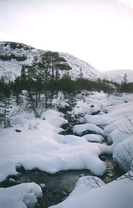 Хорошо идти налегке по старой лыжне, припорошенной легким снегом. Через некоторое время лыжня выводит к ручью. Часнайок здесь открыт и весело и жизнеутверждающе журчит между снежных шапок камней. А на том берегу сгрудилась стайка молоденьких сосенок, над которыми возвышается, раскинув руки-ветки, будто обнимая, заботливая мама-сосна.
