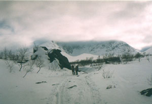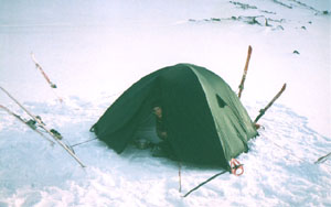 А вечером около палатки раздался хруст снега под чьими-то лыжами. Какой-то мужик, эдакий пожилой ловелас (судя по голосу): "Я вас весь вечер по долине искал, а вы в такой ямке спрятались. С манюней ходите? (Ишь, считает быстро) Что же вы от нас ушли? Там место рядом было. Палатка-то у вас какая маленькая, тесно, наверно. Ну, спокойной ночи, мы вас завтра разбудим." И пошел, покряхтывая и поскрипывая, того гляди, развалится.