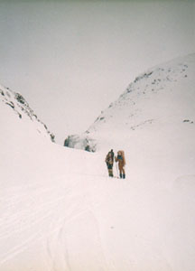 Поднимаемся все выше, идем по руслу Часнайока, вокруг каменные айсберги, увешанные бахромой сосулек. Наконец, с неизбежностью входим в тут чачу, которая лежит на хребтах. Здесь я впервые узнала, что такое белая мгла. В этой снежной белизне глаза с трудом различают расстояния и рельеф. Напряженно высматриваю теряющуюся временами лыжню, и порой приходится останавливаться, нагнувшись, не только чтоб отдохнули плечи, но и чтоб глаза посмотрели на яркий рыжий цвет моего комбеза.