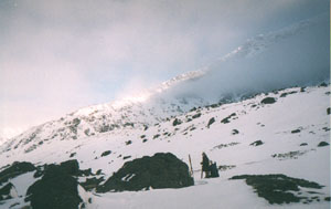 13.00. Отходим назад на 100 м. к во-он тому кустику. Ставимся и еще 2 часа строим стенку из снеговиков . Пока строили, бухнула лавина невдалеке, ночью сошло еще несколько. Около 16 ч., наконец, заползаем в домик. Хорошо!